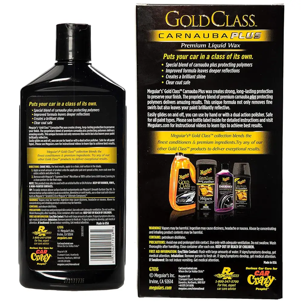 Meguiar’s Gold Class Liquid Wax es una cera premium formulada con una mezcla rica de carnauba y polímeros protectores que realzan el color, la profundidad y el brillo de la pintura. Su fórmula avanzada proporciona una protección duradera contra los elementos, dejando un acabado suave, brillante y con reflejos intensos.