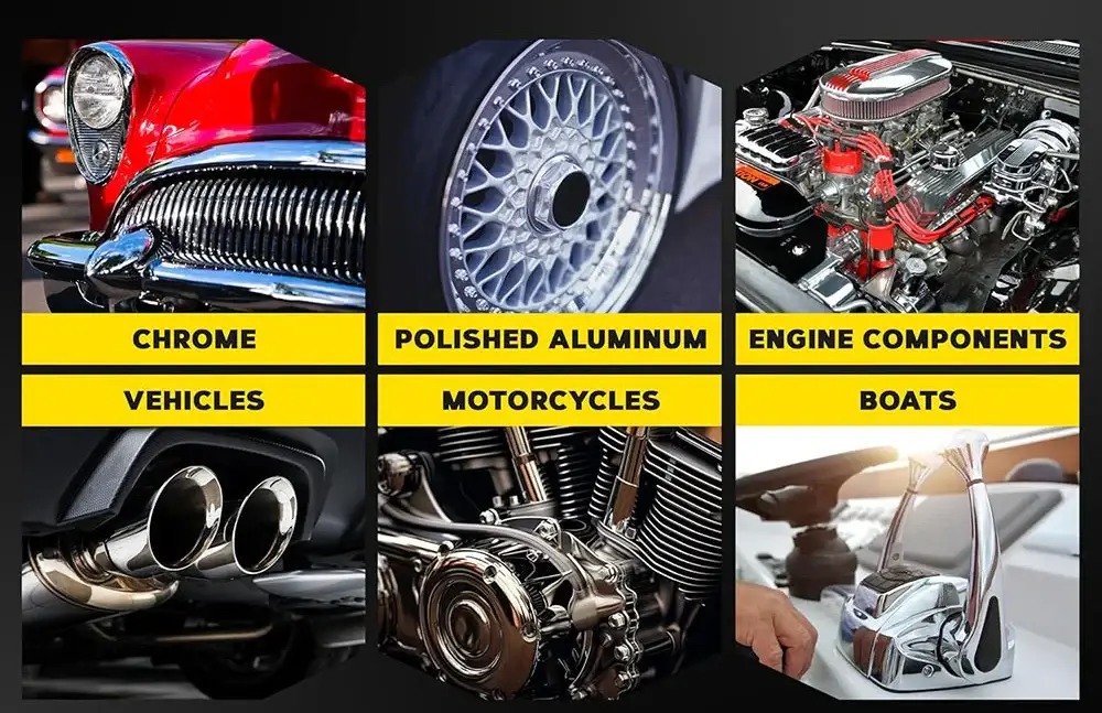 Es ideal para aluminio, acero inoxidable, cromo, latón, cobre y otros metales pulidos. Su fórmula no abrasiva trabaja de manera segura, ofreciendo resultados profesionales sin rayar ni dañar la superficie.