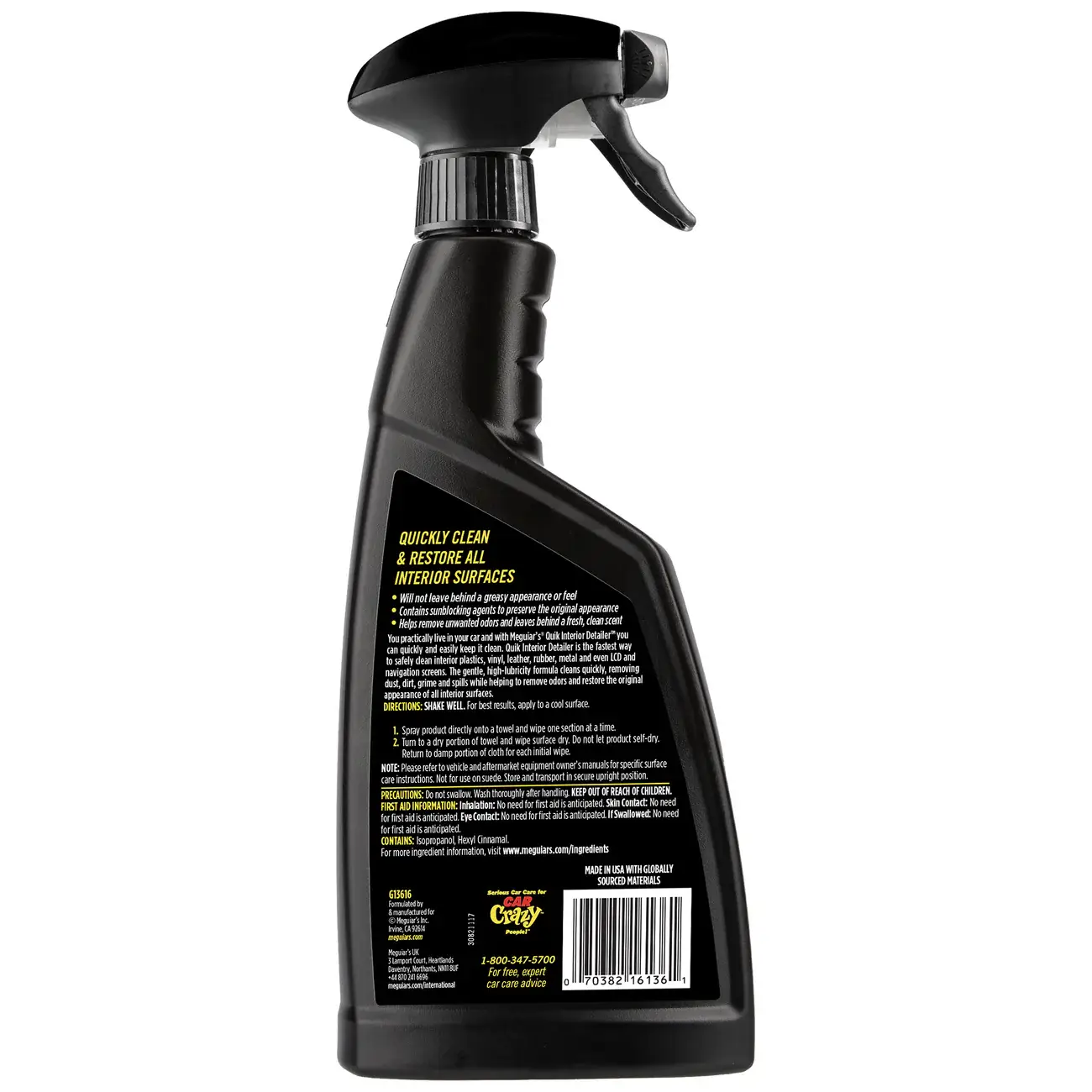 Meguiar’s Quik Interior Detailer es la forma más rápida y segura de limpiar todas las superficies interiores del vehículo. Su fórmula de alta lubricidad elimina polvo, huellas, suciedad ligera, cenizas y derrames sin dejar residuos grasos ni brillos artificiales.